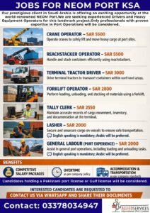 A golden overseas opportunity is available for skilled professionals to work at the world-famous NEOM Port in Saudi Arabia. This project is part of Saudi Arabia’s futuristic mega development, offering high-paying jobs for experienced candidates in port operations.