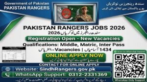 The Pakistan Rangers (Sindh) has officially announced 1434 new vacancies for 2026. Candidates from across Pakistan who meet the required qualifications can apply for various positions including combat and non-combat roles.